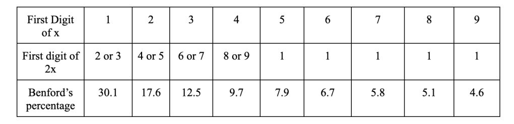 A very important part of Benford’s Law is that the pattern of numbers is independent of the units of measure. If a financial data set follows Benford’s Law in US Dollars, then it will do so in another currency, such as pounds. This property is called scale invariance. A simple way to look at the scale invariance of Benford’s Law is to look at how numbers behave when doubled. If a number begins with a 1, that number doubled will start with either a 2 or 3. If a number begins with a 2, that number doubled will start with either a 4 or 5 and so on. This is until we reach 5. After this, the numbers 5-9 doubled will all start with a 1. Here is a data table to further understand scale invariance:
