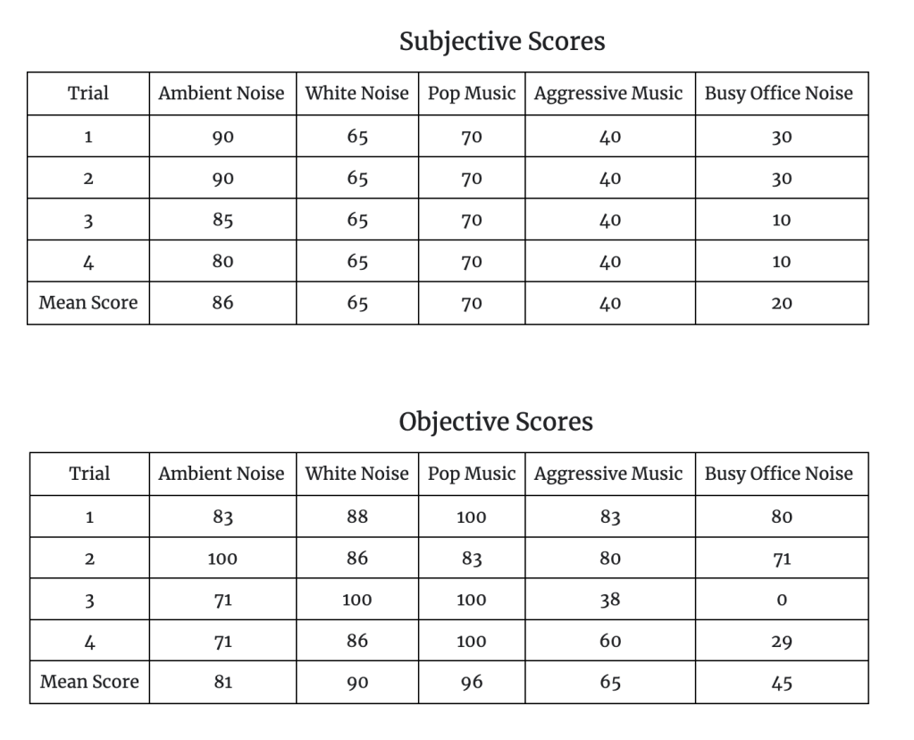 This refutes the hypothesis that a subject would perform best in an environment of white noise. The subject performed best in the subjective score category in the ambient noise environment. This was followed by pop music, white noise, aggressive music, and finally, busy office noise. The subjective score category measured the subject’s perceived ability to concentrate in each environment. The scores in the white noise environment were not as high as anticipated and did not appear to aid the subject’s perceived ability to concentrate. It was also very clear that the aggressive music and busy office noise environments had the worst scores, which were significantly less than the other three categories (ambient noise, white noise, and pop music).