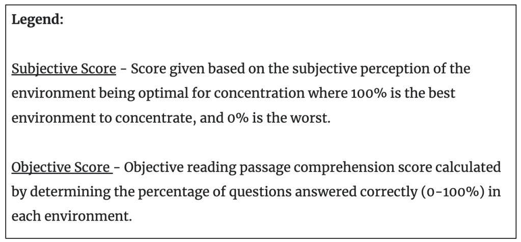 When analyzing the objective score data obtained on reading comprehension worksheets, the hypothesis that the white noise environment would yield the best scores was again refuted. The subject performed best in the pop music environment, followed by white noise, ambient noise, aggressive music, and, finally, busy office noise. The white noise environment did yield good scores but not as high as the pop music environment. This finding was somewhat surprising but understandable. Other studies have shown that certain subjects perform better in environments where they are most comfortable. Certain subjects do best in ambient noise environments with minimal distractions. Others do well with white noise to help them focus, while others perform well with soft pop music, which they find helpful to keep on task. The results of this study are limited to the preferences of the one test subject in its design.